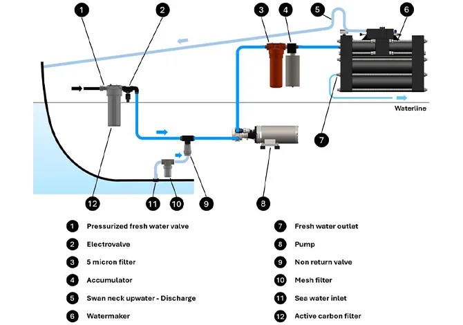 Popis: Zen 150 je odsolovač vody ideální pro posádku 8–10 osob na plachetnici o délce 50–60 stop nebo motorovém člunu či katamaránu o délce 40–50 stop. Kapacita je 150 litrů/h (39,6 galonů/h); spotřeba je 600 wattů. Napájení 24 VDC nebo AC. Všechny komponenty jsou integrovány do hlavních rozvodů a existuje jen velmi málo externích komponent, jako jsou armatury, potrubí, ventily. Díky těmto vlastnostem jsou odsolovače Zen velmi kompaktní a mají speciální ultraplochý design. Zen je ve skutečnosti navržen tak, aby se vešel do stísněných prostor a lze jej instalovat v jakékoli poloze, horizontálně i vertikálně. Není o moc větší než kufřík! Odsolovače Zen jsou vybaveny systémy rekuperace energie nové generace, které snižují spotřebu elektrické energie na minimum. Technické údaje: